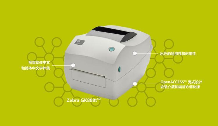 桌面型條碼打印機操作方便 - 無需培訓 直觀的 GK888 從一開始就是為了易用性而設計的。只需將打印機驅動 程序安裝到 PC 上,連接 USB 線纜即可使用。三色 LED 可顯示打印機狀 態,而易于識別的黃色觸點可讓用戶輕松操作及調整打印機。由于介質 支架是專為 4 英寸標簽設計的,因此 ZP888 提供了更簡單的介質安裝, 無需進行任何配置。