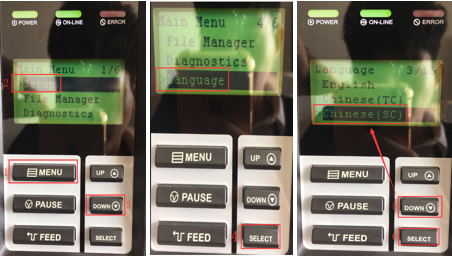 1.10打印機(jī)恢復(fù)出廠設(shè)置操作,如下圖1-5步驟后按MENU直到Ready.