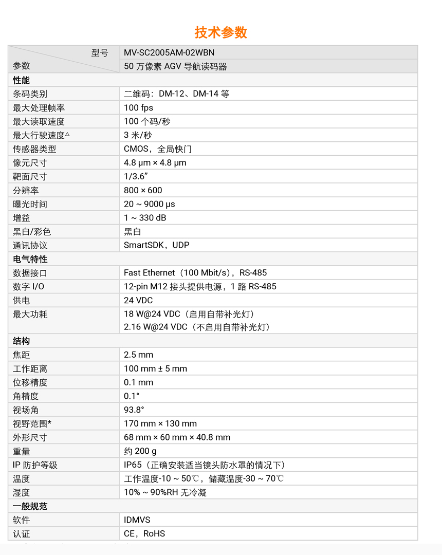 海康MV-SC2005AM 型號AGV 導航讀碼器內置讀碼算法,可有效讀取 DM-12 和 DM-14 等碼制,最大讀取速度達 100 個碼/秒。算法魯棒性強,可有效應對條碼臟污、缺損、低對比度的情形。廣泛應用于 AGV 小車導航場景。